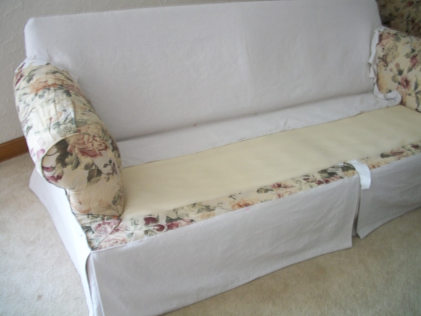 As I posted earlier, we have been working on updating my furniture and trying to get my "new" house in order. My couch which we decided to slipcover is finally finished and I want to share the pictures. We used painters drop clothes instead of buying bolts of fabric. I bought 6-7 drop clothes from Lowes. They were on sale for less than $10 each and they measured 6x9. The end result is FANTASTICALLY BEAUTIFUL! Plus, I only spent $60-$70 and now have a "Like New"couch!!! That beats buying a new couch and this couch, even though outdated in looks, is made extremely well. I bought it about 15 years ago from Lazuras Department (now Macy's) store.